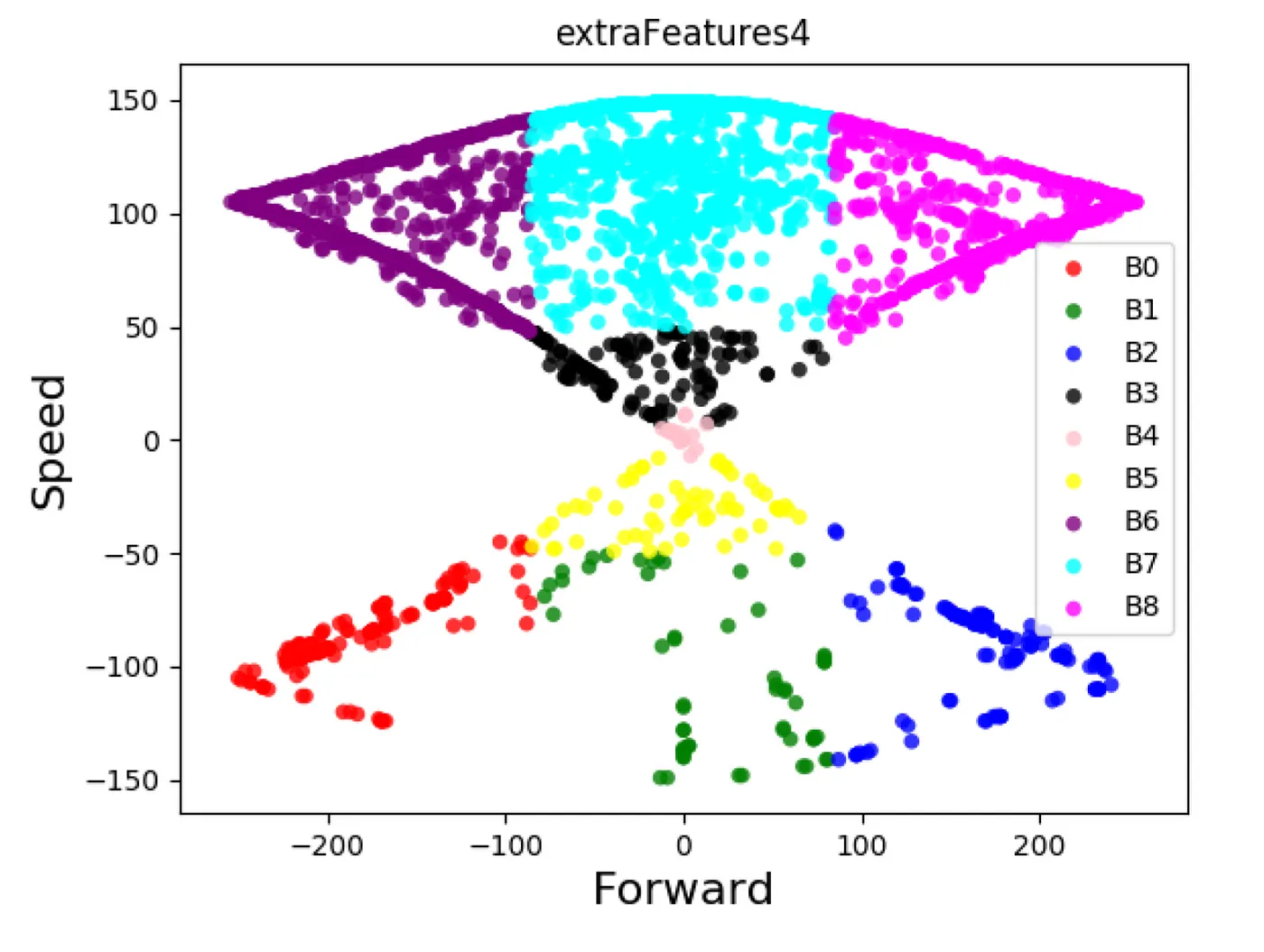 Each dot on the above graph represent the location of the finger on the trackpad at the time that a training image was sliced from the video. The top part represents forward motion, the bottom backwards motion and when the car steered it produced dots that form the diagonals of this hourglass shaped graph. We cut the data into a few logical sectors,